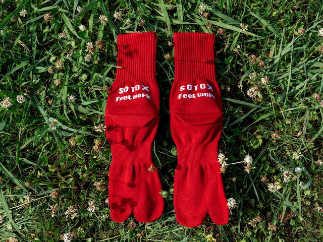 SOTOTABI(タビ型ソックス/Free:24–27cm) Color:Red x White Made in JAPAN (奈良、広陵町) “足で立つ”ことを、もう一度見つめ直す。 キャンプ、旅、街歩き—— すべての一歩は「地面を掴む」ことからはじまる。 靴下の名産地・奈良県広陵町の老舗Feetworkとつくった “外遊び”のための足袋型ソックス、SOTOTABI。 その名の通り“足袋”と“旅”を掛け合わせたネーミング。SOTOXらしく、外へ踏み出す一歩一歩に“冒険心”を添えてくれる一足です。 親指が独立した二股形状で、足本来の動きをサポート踏ん張る・歩く・走る…あらゆる動作の土台を整えてくれます。 そして今、日本の季節は“夏の延長”が当たり前に。 だからこそ、SOTOTABIは「夏秋(なつあき)」のアイテムとして提案。 軽装スタイルに映える存在感。 足袋型だからサンダルとの相性も抜群です。 サイズはフリー(24〜27cm)。 とくに女性の方は、最初は少しゆとりを感じるかもしれません。 でも、一度洗ってもらうと生地が程よくなじみ、自然なフィット感に変わっていきます。 綿 52% アクリル 21% ポリウレタン 15% ポリエステル 10% その他 2% ▶︎ YASUからひと言 昔、とある空港で出会った黒人男性のファッションが忘れられなくて。 黒のTシャツに短パン、そして鮮やかな赤いソックス。 シンプルなのに、足元の“差し色”でぐっと印象が変わることに衝撃を受けたんです。 それ以来、赤系のソックスはずっと好きで。 今回のSOTOTABIにも、その想いを込めてレッドを入れました。 夏の軽装に、ちょっとした冒険心を。 差し色として、ぜひ履いてみてください!